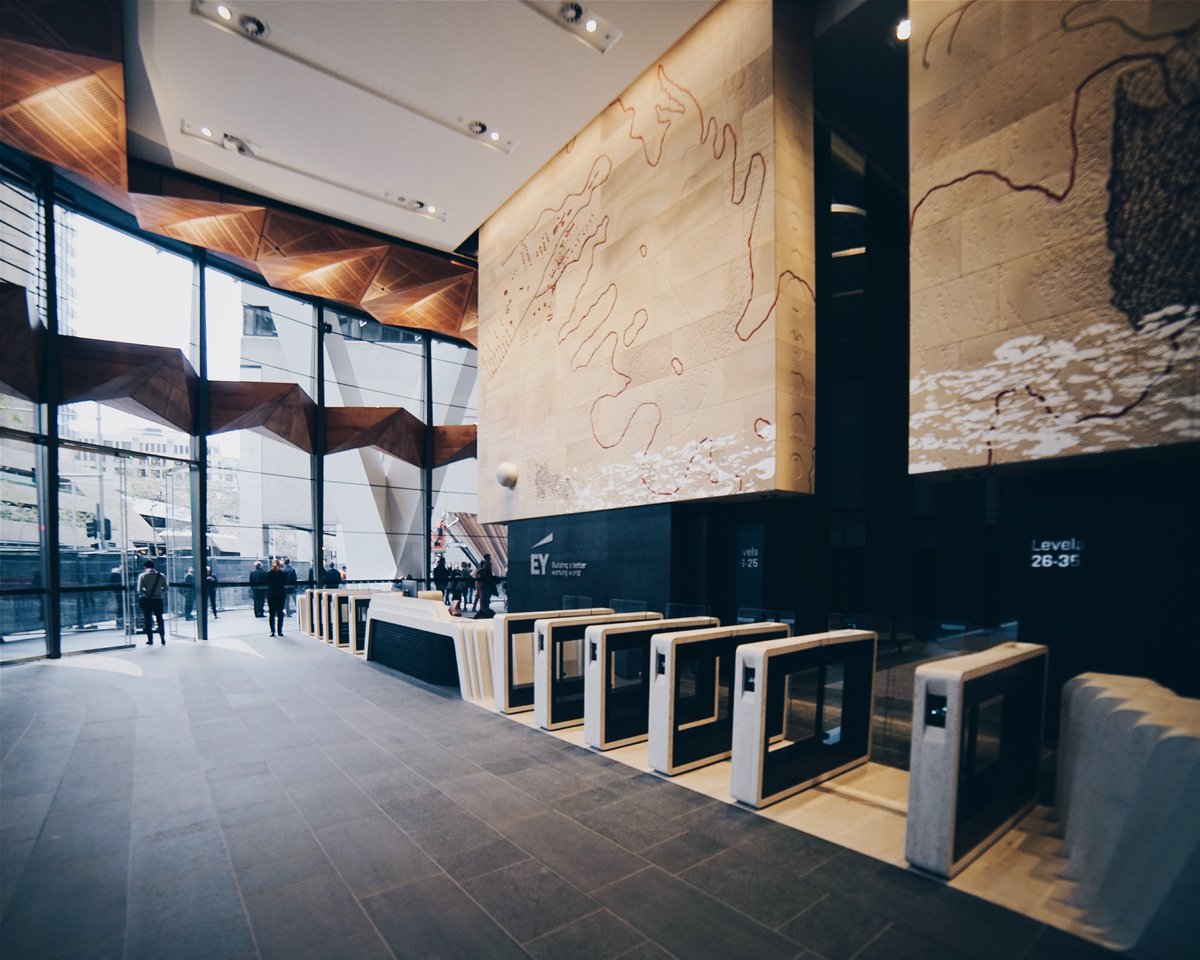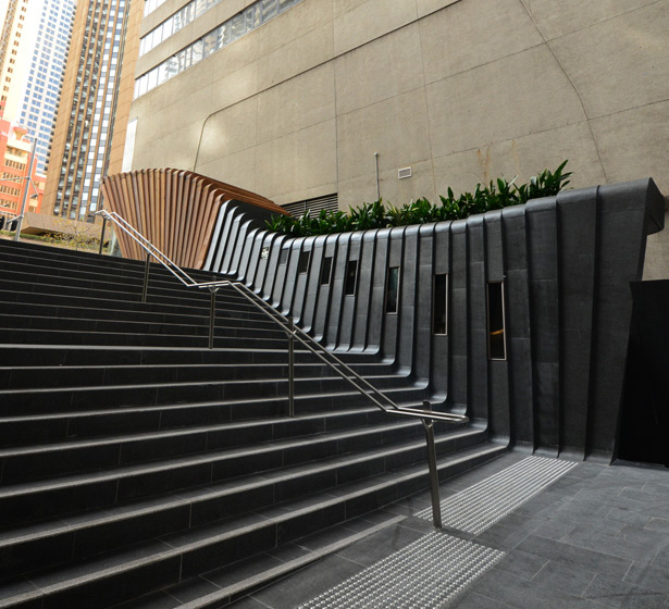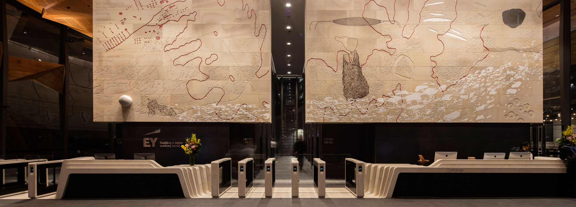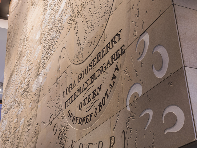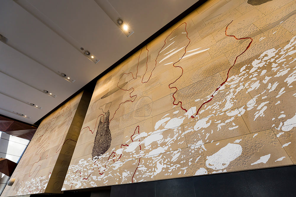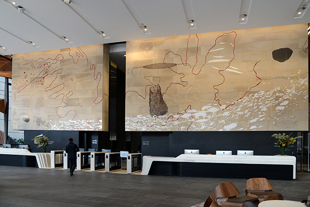 Sandstone cladding externally and internally. Marble granite floors to lobby floors and walls internally including lift cars. Two large solid granite staircases externally. All granite paving and landscaping around the footprint of the tower. Limestone carved reception desk, concierge desk, turnstiles, coffee tables and tv screens. Stone vanities to all 34 levels of the tower. Granite pavers on pedestals to two terraces. Sandstone art wall internally that showcases the lobby installed on steel frames, Art work is “Ngarunga Nangama: Calm Water Dream by Judy Watson.