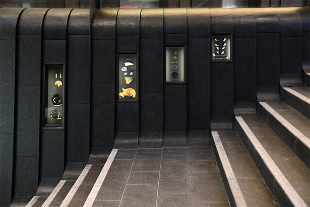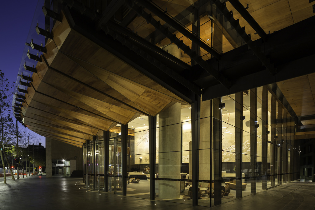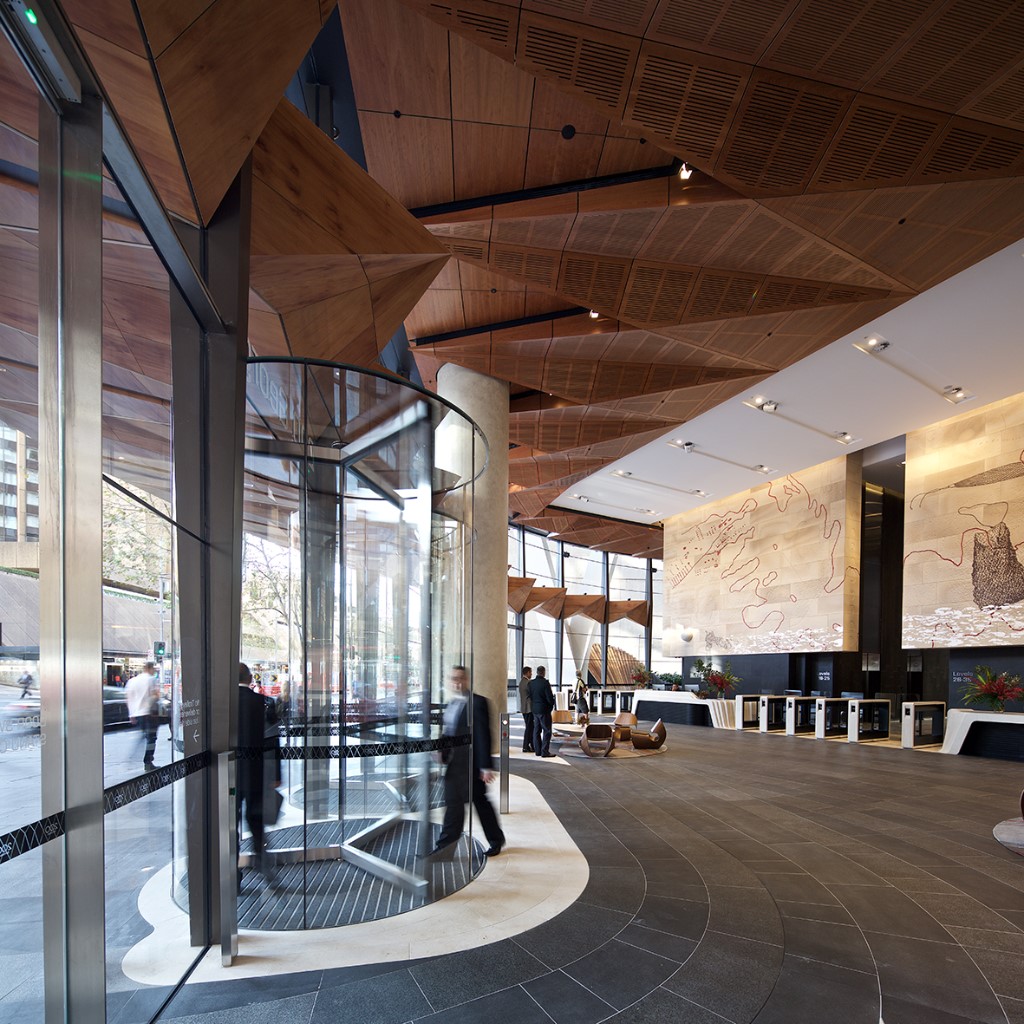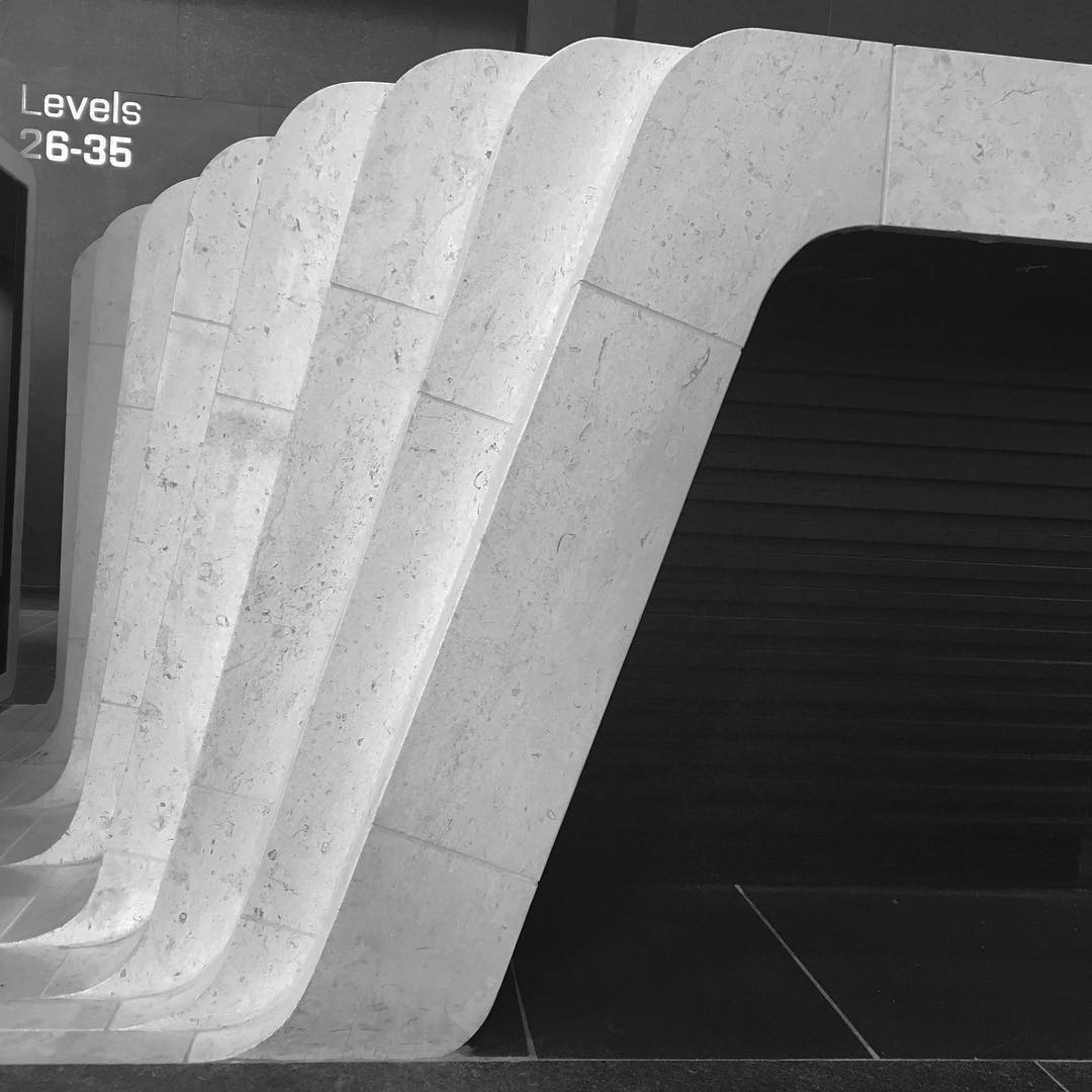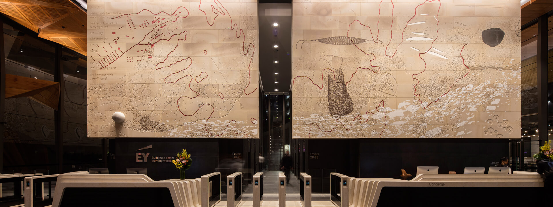 Sandstone cladding externally and internally. Marble granite floors to lobby floors and walls internally including lift cars. Two large solid granite staircases externally. All granite paving and landscaping around the footprint of the tower. Limestone carved reception desk, concierge desk, turnstiles, coffee tables and tv screens. Stone vanities to all 34 levels of the tower. Granite pavers on pedestals to two terraces. Sandstone art wall internally that showcases the lobby installed on steel frames, Art work is “Ngarunga Nangama: Calm Water Dream by Judy Watson.